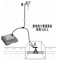 接地釬位置的選擇:為保證探測效果,接地釬應與管線距離5m以上,而且黑色接地導線應盡量和管線方向垂直。