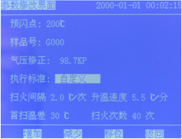1)在此界面中預(yù)閃點、樣品號、氣壓、標(biāo)準(zhǔn)和時間,都可按提示進(jìn)行調(diào)整,修改完成后按【返回】鍵。回到主操作界面。