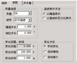 變化初值:變化初值是前面所設(shè)置好的諧波的值。初值是從前頁的諧波數(shù)據(jù)頁面中取來的,不能直接修改。要修改這個(gè)初值必須在諧波數(shù)據(jù)頁面里進(jìn)行。初值在這里以幅值的方式表示。