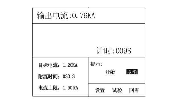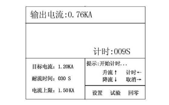 按上,輸出電流將不斷上升,松開就停止升流,如果到上限就提示滿量程;按下↓,輸出電流將不斷下降,松開就停止降流,如果到下限就提示已回零;按計時一,計時開始工作,到耐流時間計時結(jié)束完成試驗;